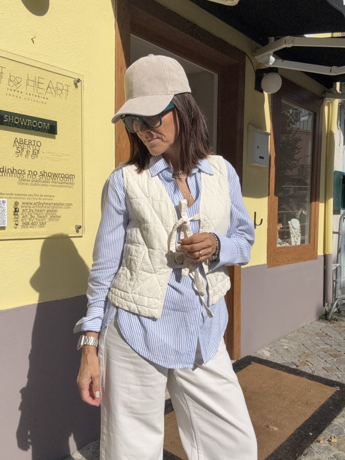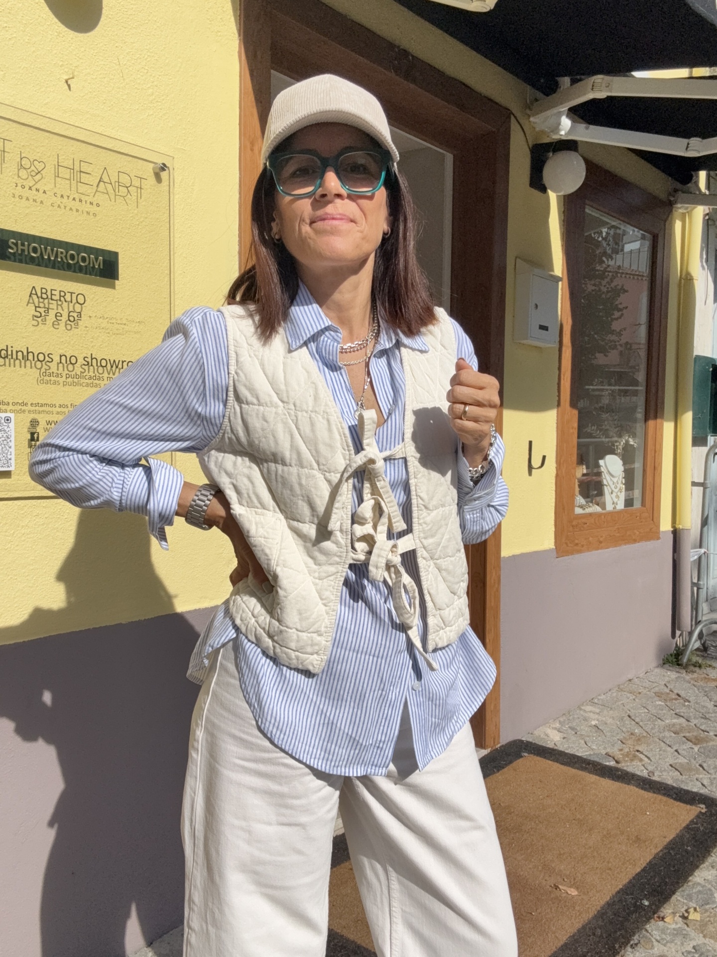 Colete Bombazine com Lacinhos 32,00 € Desconto de %. Partilhar Comprar Contactar Colete Bombazine com Lacinhos e bolsos cor branco Marfim Veste bem ate M Instagram casacos e coletes: https://www.instagram.com/p/DQY_jjTCEwW/ Tags Colete
